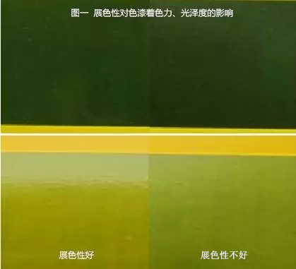 色漿加入基礎漆后展色性的好壞決定了該色漆的著色力、光澤度、鮮艷度、耐候性等性能(見圖一、圖二)。展色性不好的主要表現是色漆在施工時可以明顯發現有色點、輥痕、刷痕;同一批色漆隨時間的推移顏色變深或變淺。尤其是藍灰色系、咖啡色系、灰色系顏色。