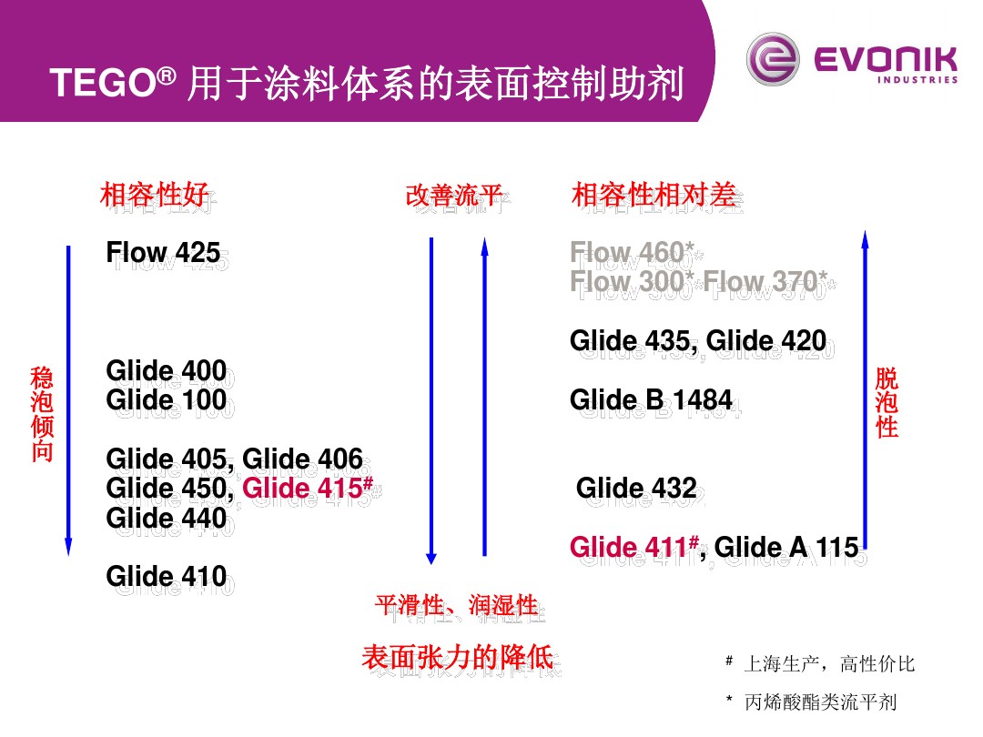 TEGO Glide 410流平劑 有最好的滑度,有良好的流平性,降表面張力最強(qiáng),但穩(wěn)泡比較嚴(yán)重,對啞粉排布和手感性極佳