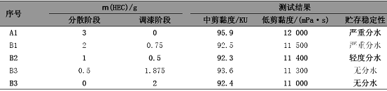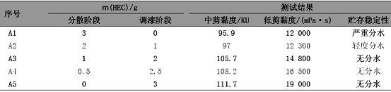 表2為A組試驗(yàn)詳情,試驗(yàn)中配方其他組分不變的情況下,將3gHEC調(diào)整搭配比例進(jìn)行了5組試驗(yàn)。