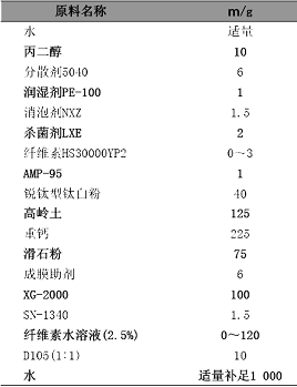依次向容器中加入水、丙二醇、分散劑、潤濕劑、消泡劑和纖維素,將纖維素分散至無粉團(tuán),加入pH調(diào)節(jié)劑,然后加入各種粉料,將分散機(jī)調(diào)至高速開始分散,半小時(shí)后調(diào)低轉(zhuǎn)速加入成膜助劑、乳液和消泡劑,然后用增稠劑增稠。纖維素以兩種方式添加到體系中:一是在分散階段加入;二是配置成2.5%的水溶液(膏體)在調(diào)漆階段加入。2.5%纖維素水溶液配置方法:將纖維素加入水中分散至無粉團(tuán),然后加入適量的pH調(diào)節(jié)劑調(diào)節(jié)pH值,攪拌使其完全溶解最終成膏狀,待用。表1為基礎(chǔ)配方。