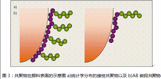 自然這些結構能夠與顏料表面接觸特別多,因此被視為高效的潤濕分散劑。圖3可以看到,和純AB嵌段共聚物相比,每單位體積里接枝聚合物的錨定基團和穩定鏈段的數量要多得多。