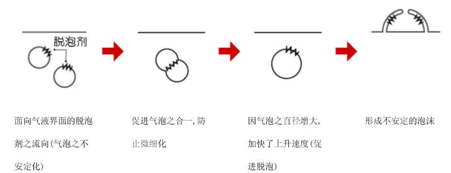 消泡劑添加到泡沫體系中,會向氣液界面擴散, 使具有穩泡作用的表面活性劑難以發生恢復膜彈性的能力。