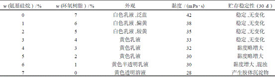 表1環(huán)氧樹脂和氨基硅烷的用量比對乳液性能的影響
