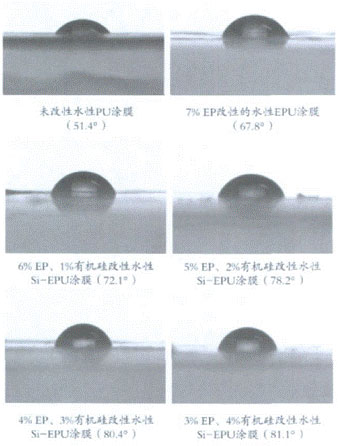 用4%的環(huán)氧樹脂和3%的氨基硅烷合成了Si-EPU乳液,該乳液分散均勻且具有較好的穩(wěn)定性,涂膜的耐水性、耐熱性、疏水性等性能因有機硅的加入而明顯提高。通過紅外光譜分析證明環(huán)氧樹脂接枝在Si-EPU聚合物分子鏈上,并發(fā)生開環(huán)反應,分子鏈上因Si—O鍵的存在而具有有機硅化合物的表面特性。