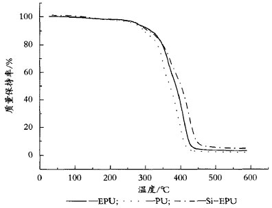 采用熱重分析儀分別對未改性的水性PU涂膜、7%EP改性的水性EPU涂膜和4%EP、3%有機硅改性的水性Si-EPU涂膜進行熱失重分析,并繪制出3條TG曲線進行比較,見圖4。