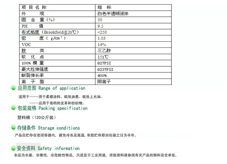 - 用途:用于柔感涂料、紙張油墨、紙張上光油;應用于高檔的皮革和紡織物。