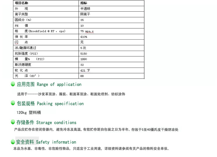 - 為供應打印油墨及皮革面漆類客戶,三升推出水性聚氨酯樹脂PU-3339,此款樹脂表面絲滑,中軟,耐失光;耐水優異,沸水澆淋,不發白,不起泡;斷裂伸長率為300-450%;穩定性好,耐磨性能優異