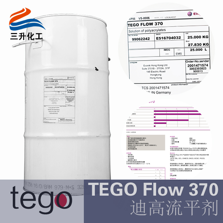 以下為三升貿(mào)易暢銷產(chǎn)品,贏創(chuàng)德固賽迪高助劑流平劑的TEGO Flow 370流平劑 ,TEGO Flow 370流平劑非常適用于薄膜類涂料表面,優(yōu)異的耐高溫?zé)岱€(wěn)定性,能夠達(dá)到220℃。